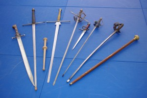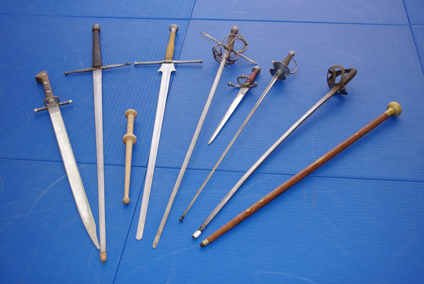 Stumpfe Trainingswaffen aus Holz, Aluminium und Stahl. Ob Langschwert, Rapier, Dolch, Säbel oder Stock – die verschiedensten historischen Fechtsysteme werden trainiert. (Foto: Thorsten Piepenbrink)