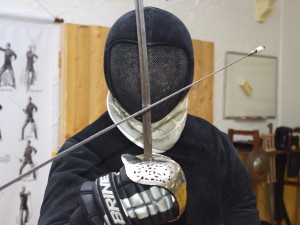 Sicherheit geht grundsätzlich immer vor: Obwohl die Säbel stumpf sind, wird der Kopf durch eine Fechtmaske geschützt. (Foto: Thorsten Piepenbrink)
